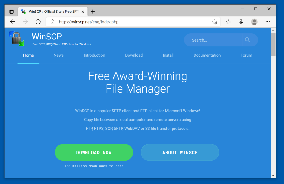On your Windows machine, in a Web browser, go tohttps://winscp.net/eng/index.phpDownload and install WinSCP, as shown below.