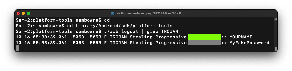 cd cd Library/Android/sdk/platform-tools ./adb logcat | grep TROJAN