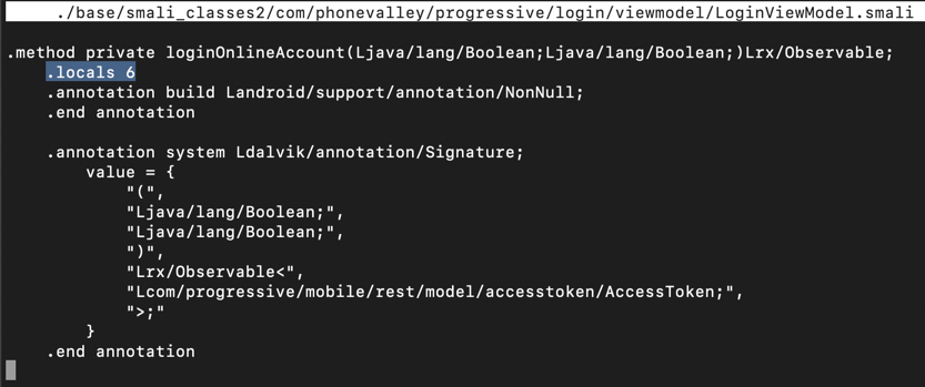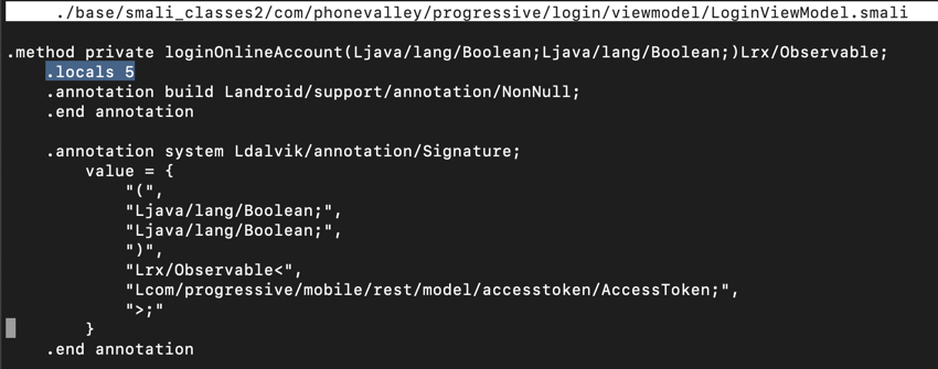 You see the start of the ".method private loginOnlineAccount(" function, as shown below.