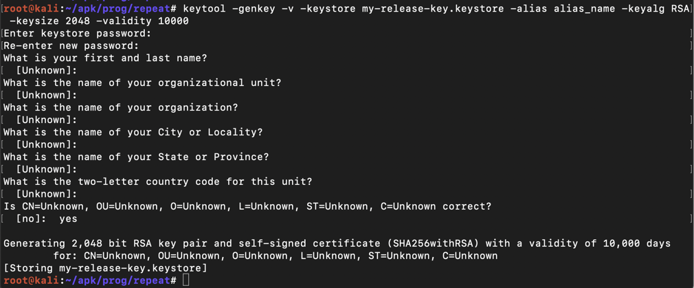 keytool -genkey -v -keystore my-release-key.keystore -alias alias_name -keyalg RSA -keysize 2048 -validity 10000