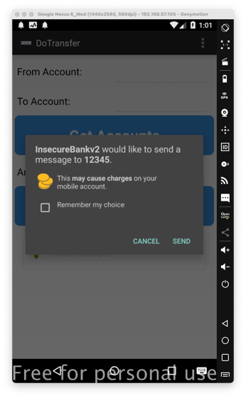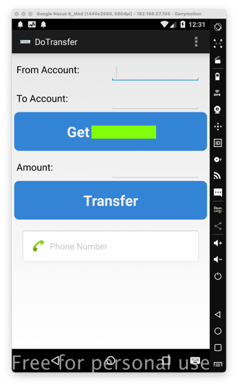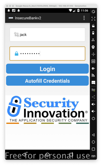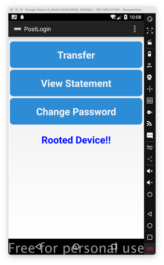 On a rooted Android device, such as Genymotion, the InsecureBank app and log in. You see a message saying "Rooted Device!!", as shown below.
