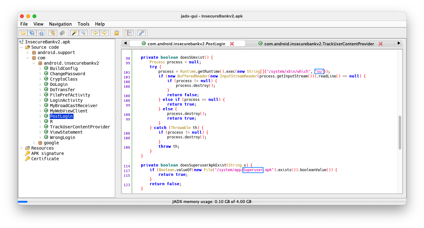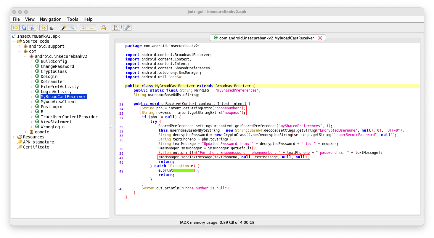 To understand this receiver, we need to examine the source code. Open the InsecureBankv2.apk file in jadx-gui, which you prepared in a previous project.