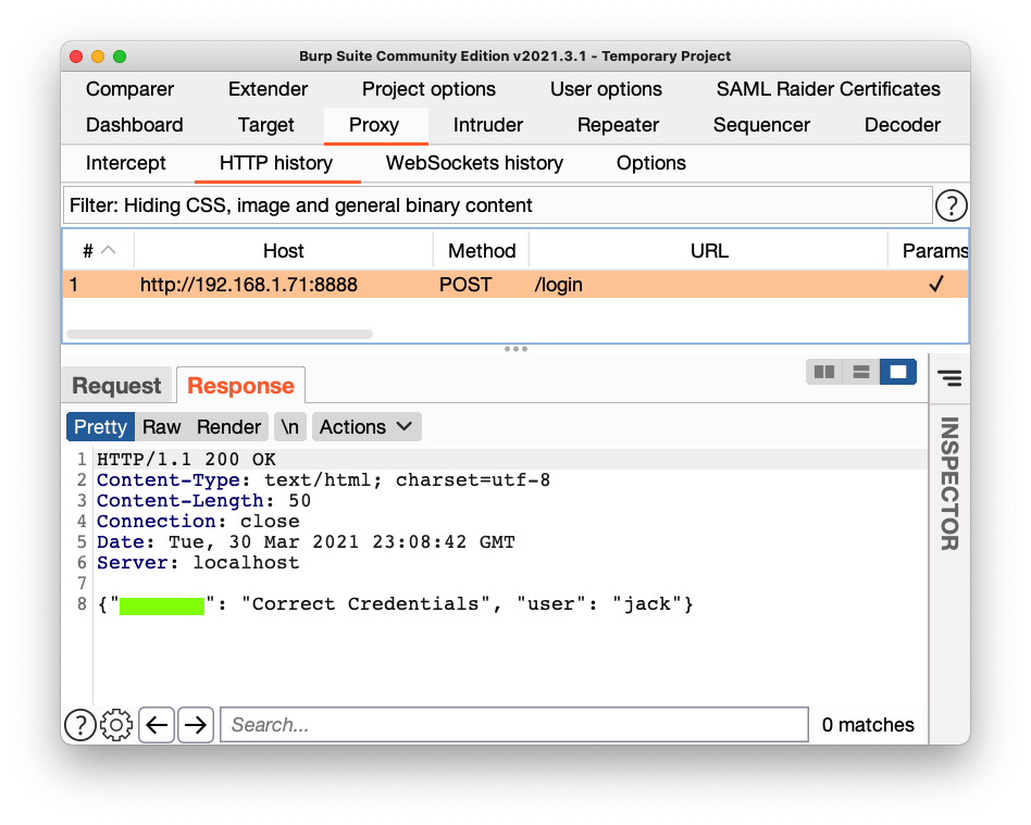 In Burp, in the server's response, find the text covered by a green box in the image below. That's the flag.