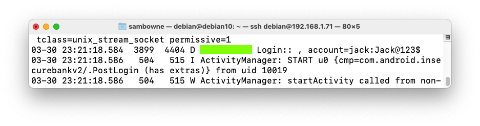 In the InsecureBank app, at top right, tap the three-dot menu icon, then tap Restart.Open a second Terminal window to your Linux server and execute this command to monitor the Android log:
