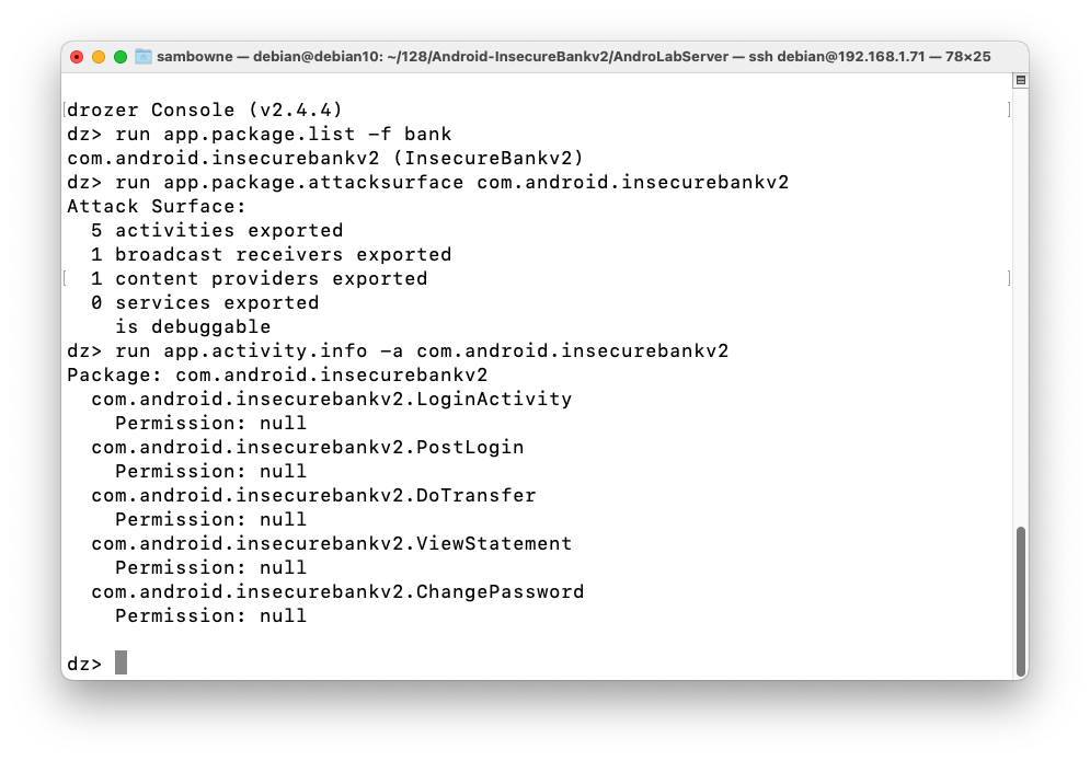 run app.package.list -f bank run app.package.attacksurface com.android.insecurebankv2 run app.activity.info -a com.android.insecurebankv2