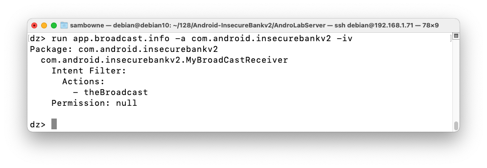 In Drozer, execute this command to see the exported broadcast receiver and its intent filter:As shown below, the receiver name is MyBroadcastReceiver and it processes actions with the name theBroadcast. No permission is required to send an intent to this receiver.