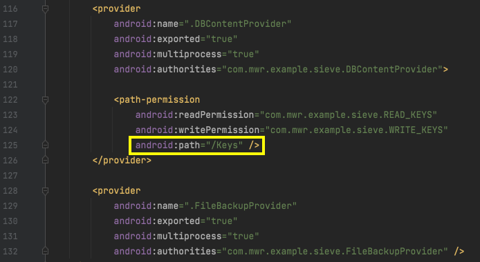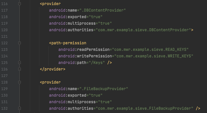 The first activity is explicity exported with an "exported = true" line, and the second activity includes an intent-filter which makes it exported too.