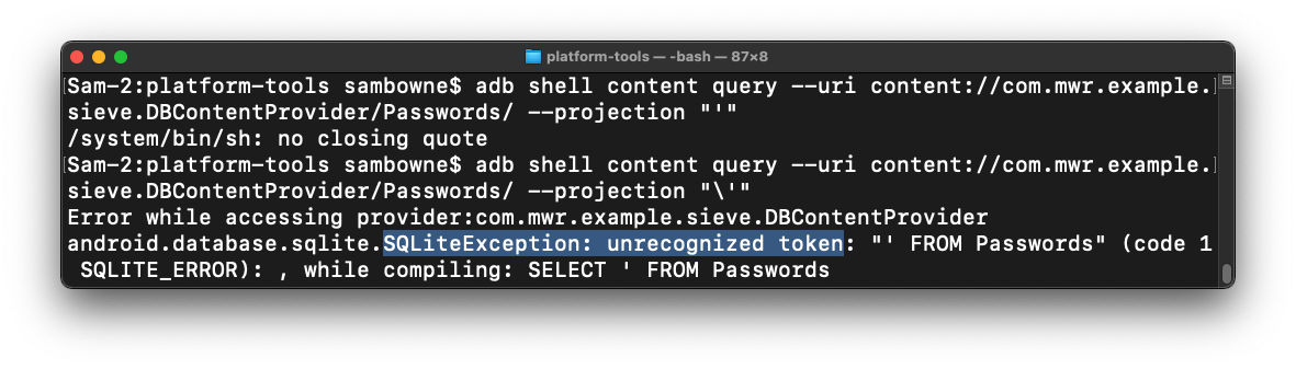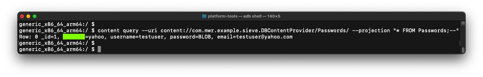 adb shell content query --uri content://com.mwr.example.sieve.DBContentProvider/Passwords/ --projection "'"