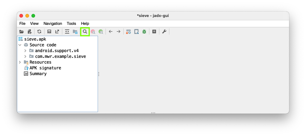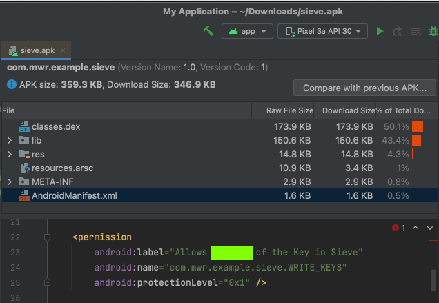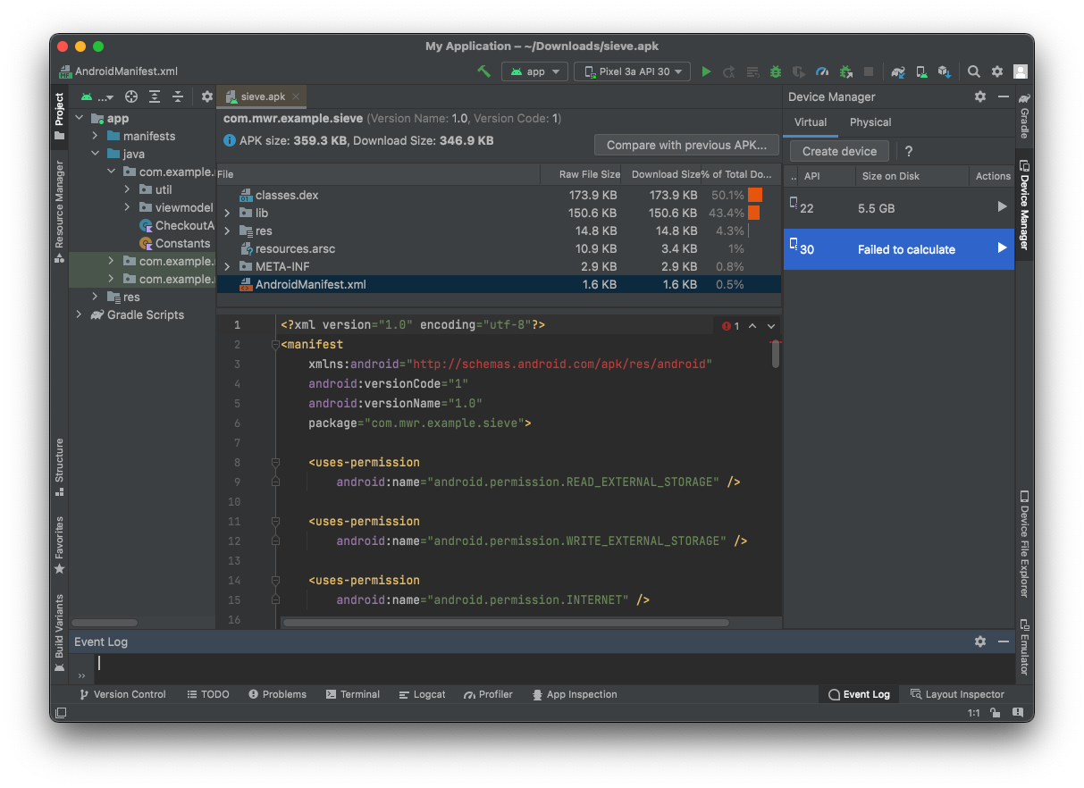 Drag the seive.apk file and drop it on the center pane of Android Studio.In the top section, click AndroidManifest.xml. Its contents appear in the lower pane, as shown below.