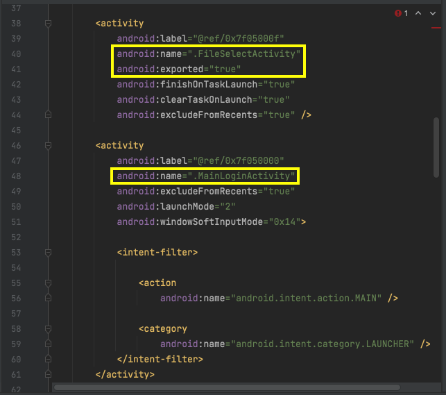 They are named FileSelectActivity and MainLoginActivity, and they are both exported, as shown below.