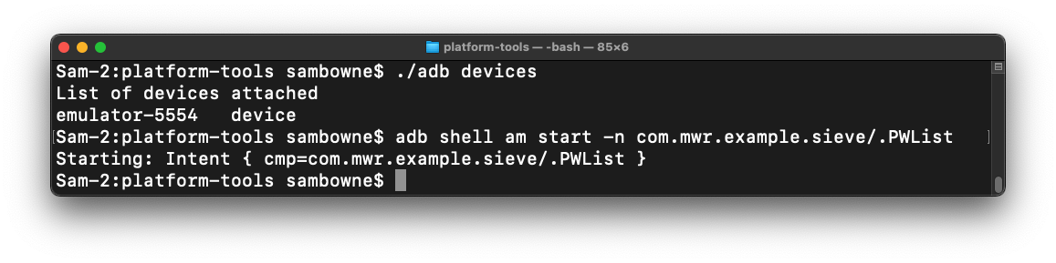adb shell am start -n com.mwr.example.sieve/.PWList