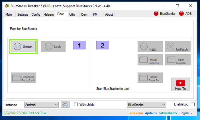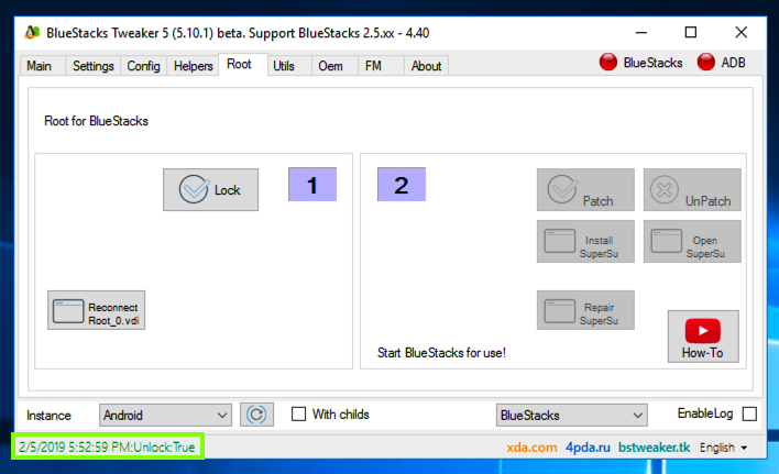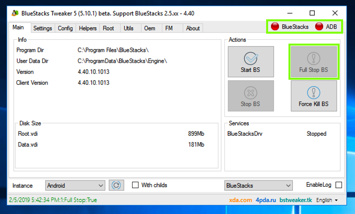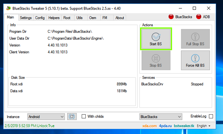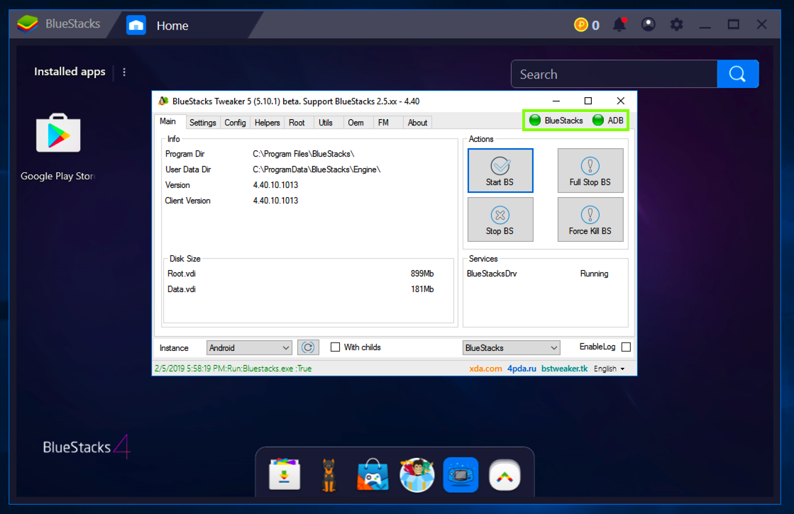 Wait until Bluestacks boots up. In BlueStacks Tweaker, at the top right, both the BlueStacks and ADB buttons should be green, as shown below.
