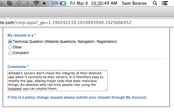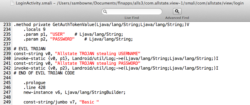 Allstate should add integrity-checking to their server-side code. Obfuscating their smali code would also be an improvement, with a powerful obfuscator like DashO, not the worthless ProGuard.