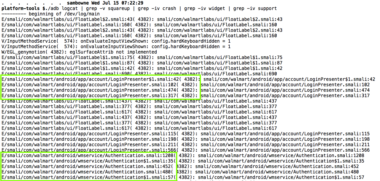 ./adb logcat | grep -v squareup | grep -iv crash | grep -iv widget | grep -iv support