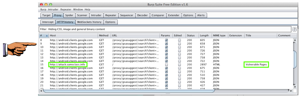 Find the line that shows the http://attack.samsclass.info page loading, as shown below.