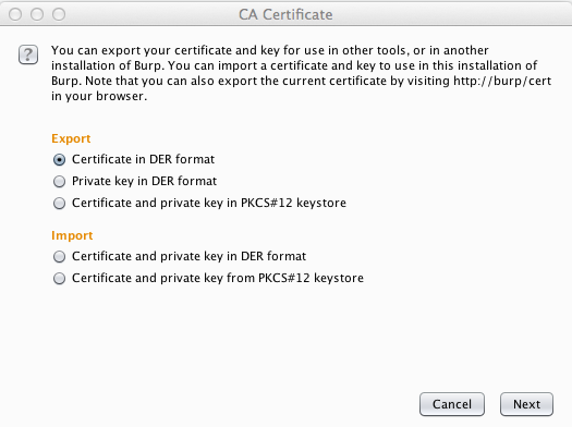 In the "CA Certificate" box, click the "Certificate in DER format" button, as shown below.
