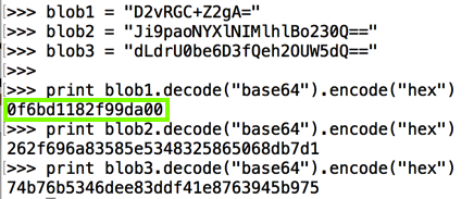 Decoding these blobs in Python shows that the first one is the salt, matching the value shown in the log above.