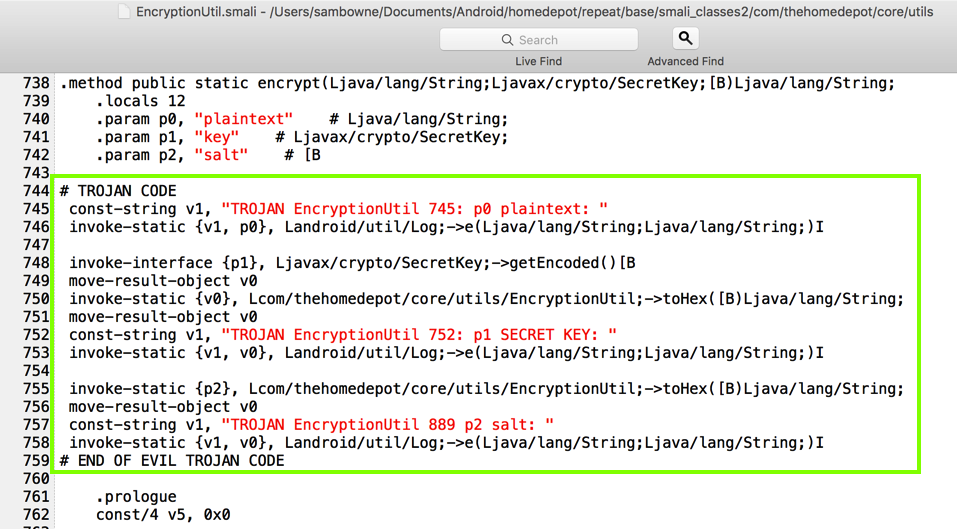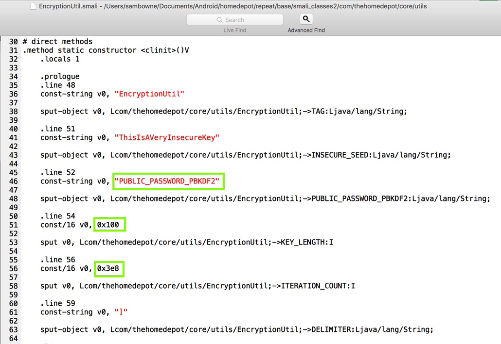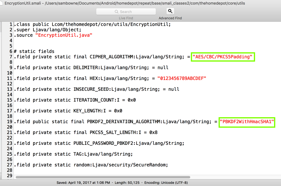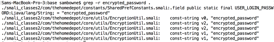 The local storage used the label encrypted_password, so searching for that string reveals the encryption code, which is all in a single file named EncryptionUtil.smali.