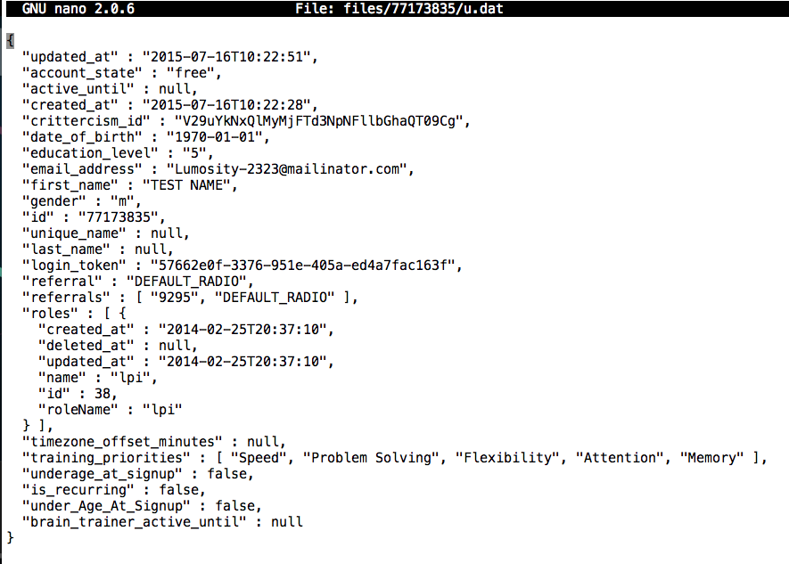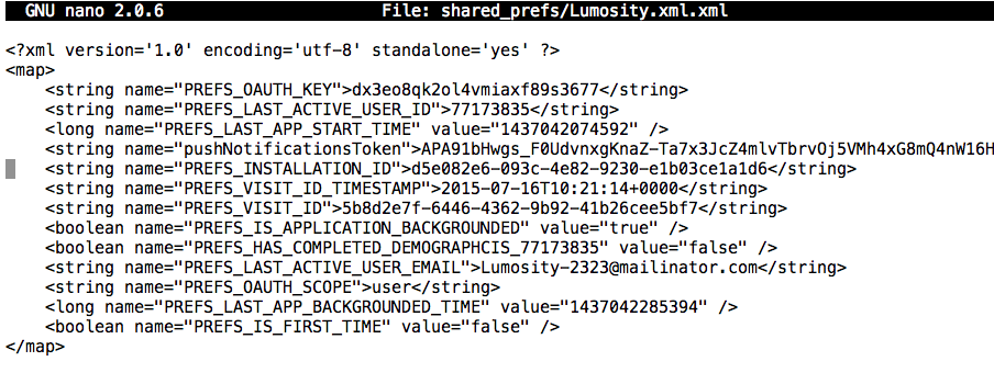 The personal data is apparently stored in two XML files: files/77173835/u.dat and /shared_prefs/Lumosity.xml.xml