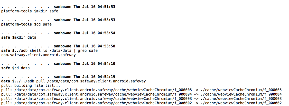 These commands move to the SDK tools directory, create a directory and a subdirectory to put the files in, find the correct path to the Safeway app's local data, and pull it to your computer.