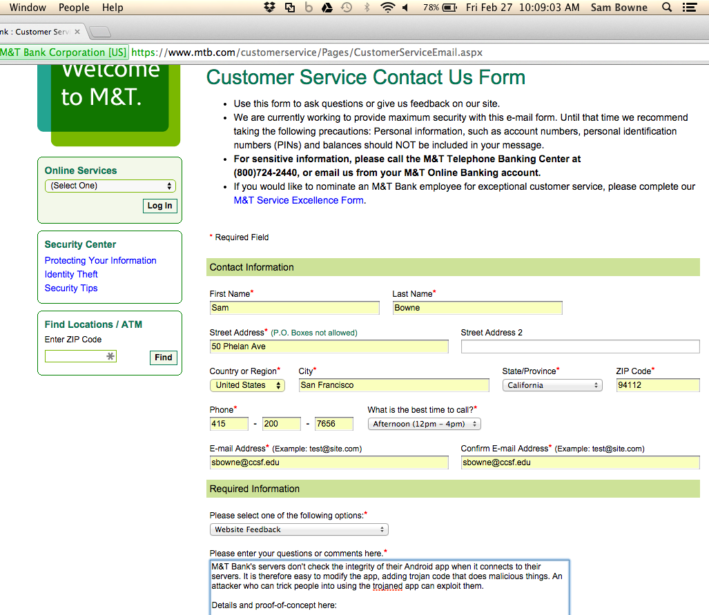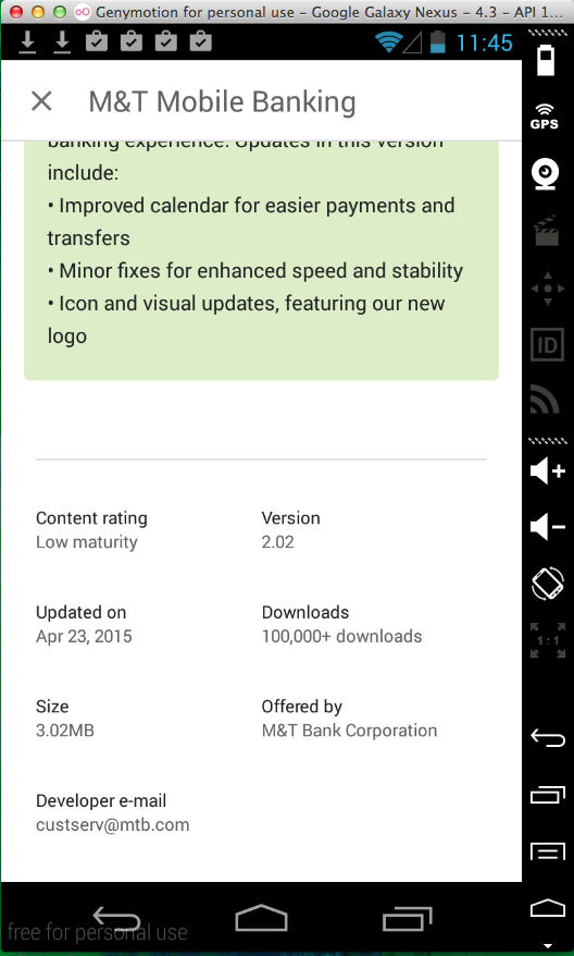 M&T Bank should add integrity-checking to their server-side code. Obfuscating their smali code would also be an improvement, with a powerful obfuscator like DashO, not the worthless ProGuard.