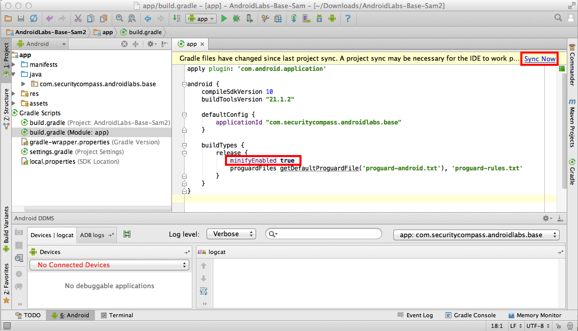 In the top right pane, change "minifyEnabled" from "false" to true, as indicated by a red outine in the figure below.