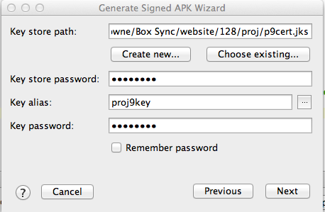 In the "Key store path" screen, the path to the key you created in project 9 shoud fill in automatically. All you need to do is to fill in the passwords, as shown below.