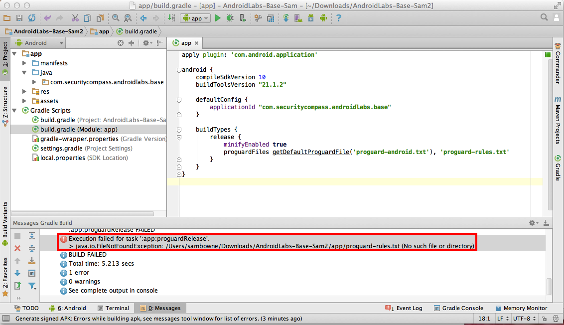 The build fails. A message at the bottom says we need to provide a "proguard-rules.txt" file,