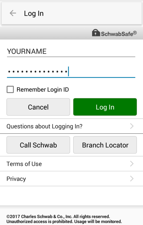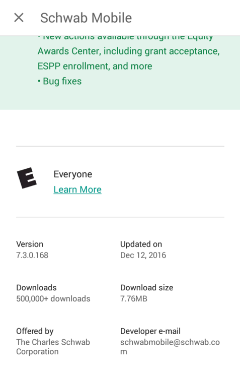 If Schwab ever fixes this (unlikely), you can get the app version I used here:https://samsclass.info/128/proj/com.schwab.mobile-1.apk
