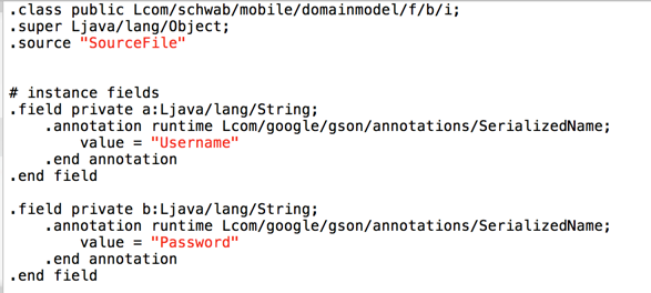 When I decompiled the app version from May, 2015, Schwab didn't use ProGuard, so all the names were readable, as shown below.