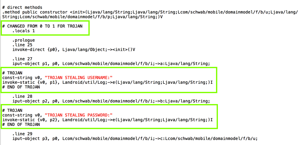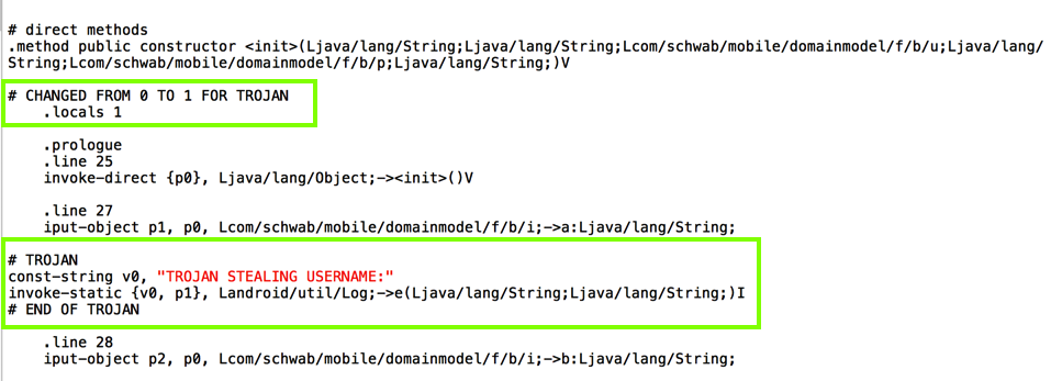 This is a nasty thing to do. Only distribute your trojaned apps in controlled test environments!Please be responsible in how you use this information! If you commit crimes, I won't be able to save you.