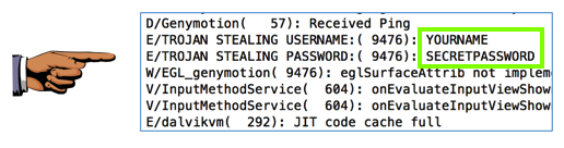 To demonstrate the vulnerability, we'll put the username and password into the Android log. That is a famously insecure place to put them, because any app on the device can see them.