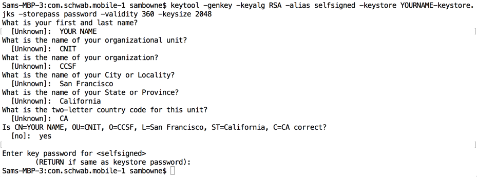 To make your certificate, execute this command, replacing "YOURNAME" with a version of your own name that does not include any spaces: