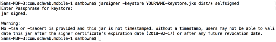jarsigner -keystore YOURNAME-keystore.jks dist/* selfsigned