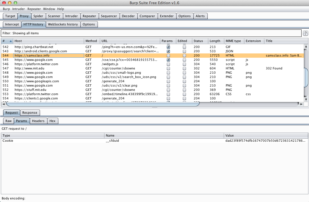 In Burp, on the Proxy tab, on the "HTTP history" sub-tab, you should see https://samsclass.info, as shown below.