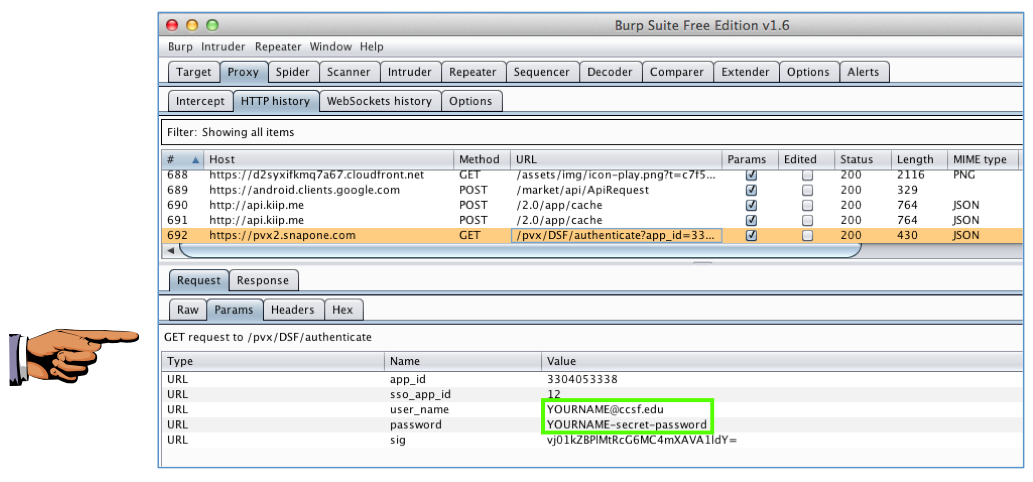 In Burp, examine the HTTP History. You should find a GET request to a snapone.com server containing your username and password, as shown below.