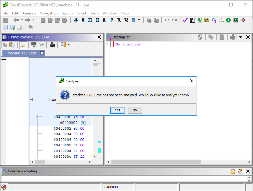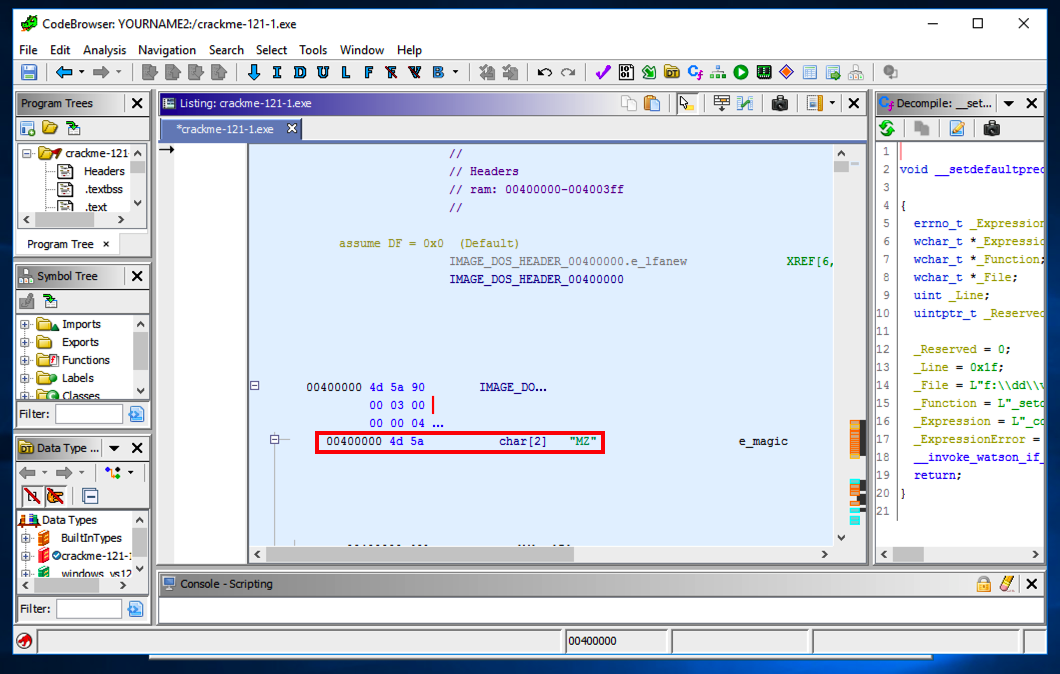 The main Ghidra window appears, showing the assembly code for the file in the large central pane, beginning at address 00400000 with the letters "MZ", as shown below.