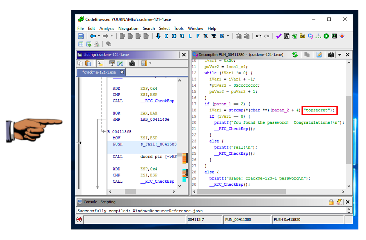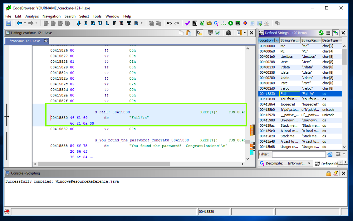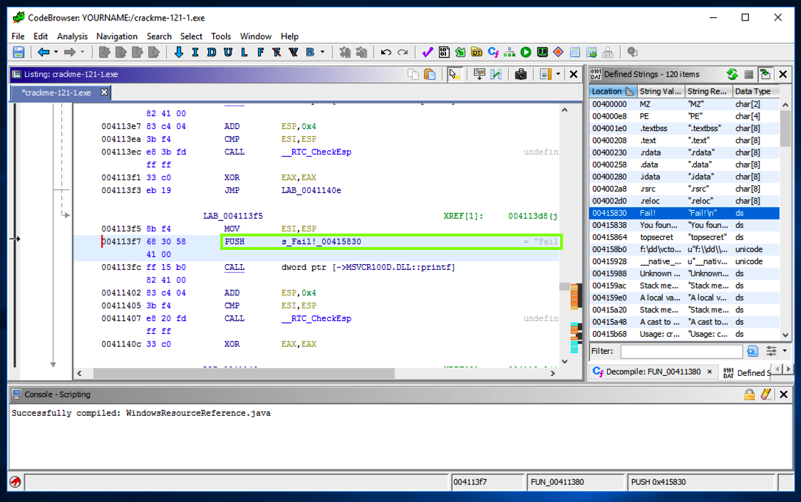 In the left pane, on the line showing the "Fail!\n" string, on the right side, after the "XREF" label, double-click FUN.
