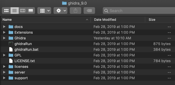 If you are on a Mac or Linux, double-click ghidraRun, as shown below. If you are using Windows, double-click ghidraRun.bat.