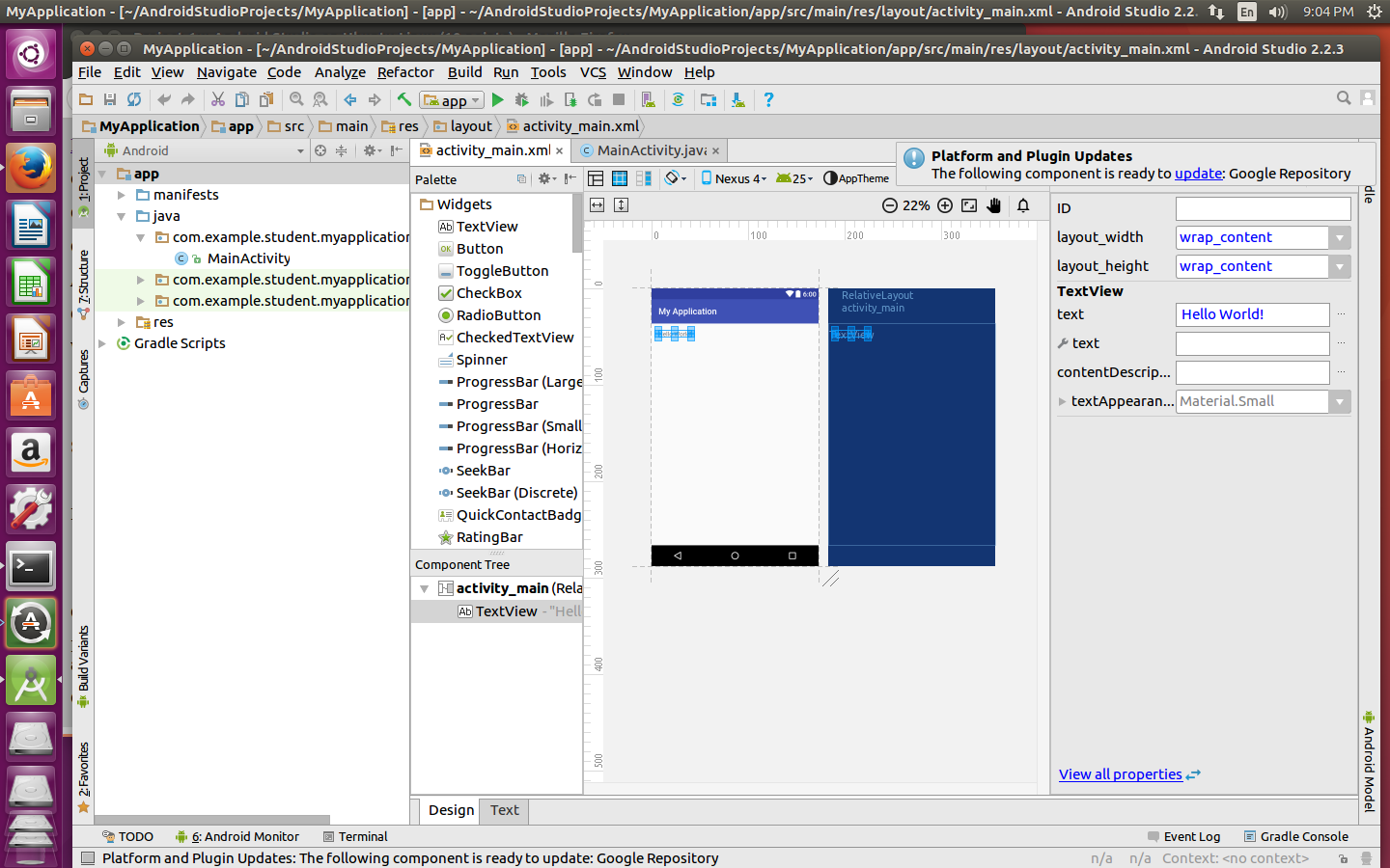 A much easier way to control your app is to use the right pane. Click the activity_main.xml tab.