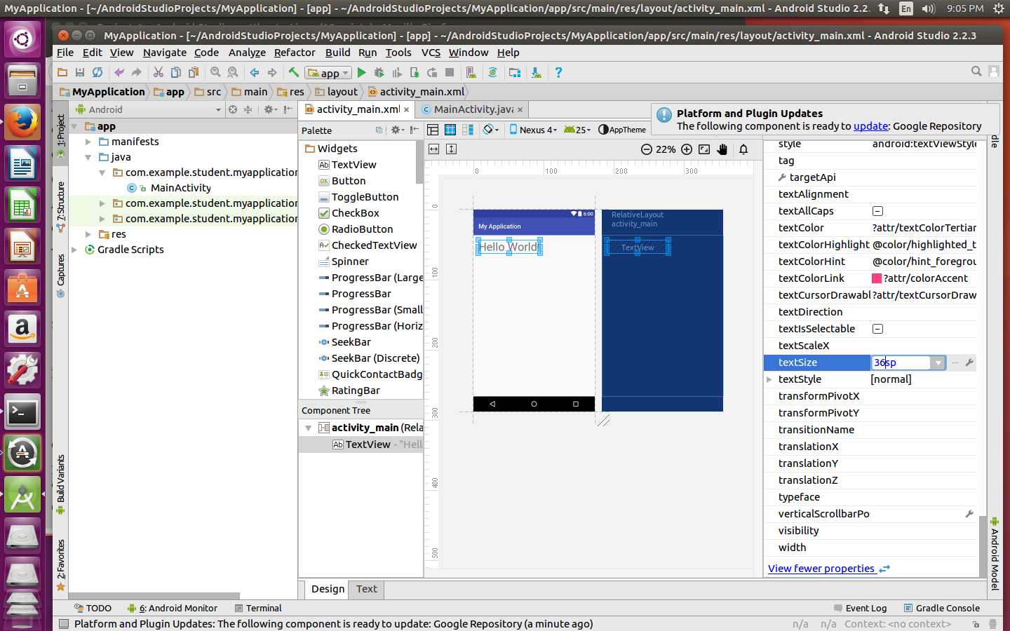 In the lower right of the Android Studio window, in the Properties section, scroll down to textSize and change the size to 36dp. Press Enter. The "Hello world" text gets larger, as shown below.