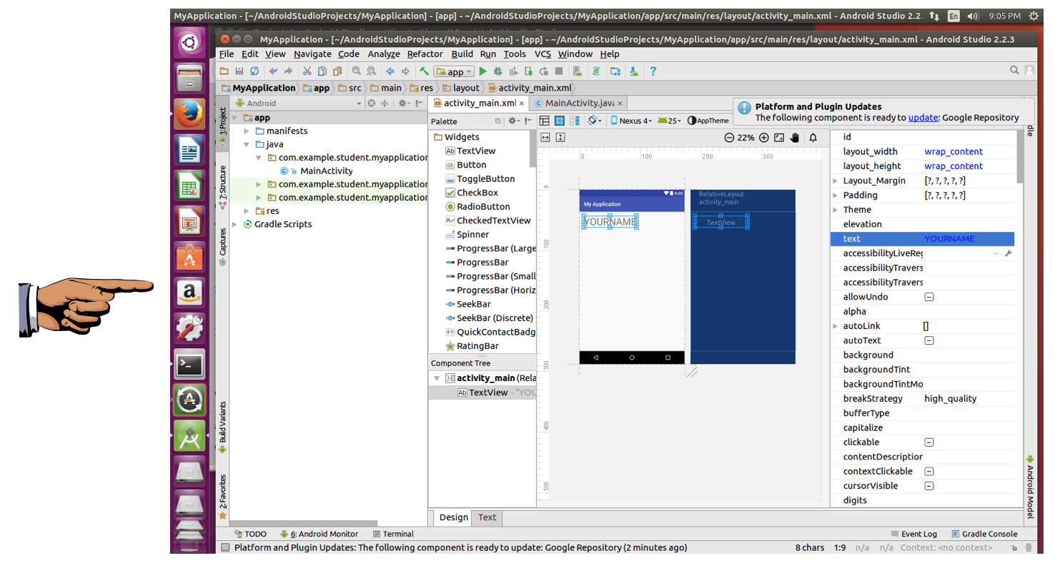 In the right of the Android Studio window, in the Properties section, scroll up to the top. Find text and change it to YOURNAME.