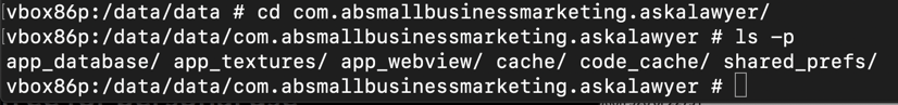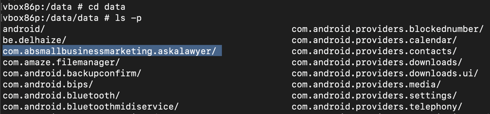 Each app has its own directory here. Most of them begin with "com.android" because they are part of the Android operating system, but near the top, you see the com.absmallbusinessmarketing.askalawyer/ directory, highlighted in the image below.