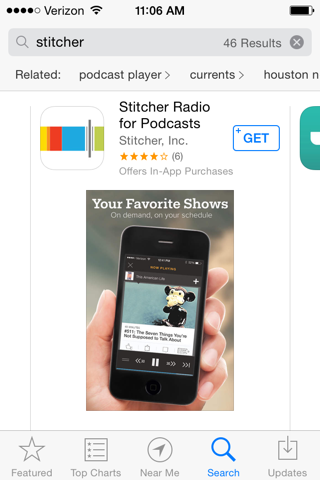Search for stitcher. Install "Stitcher Radio for Podcasts", as shown below, by tapping GET and tapping INSTALL.