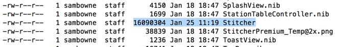 Scroll up and find the "Stitcher" file--this is the main executable file that launches the app. It's a large file, approximately 16 MB in size, as shown below.