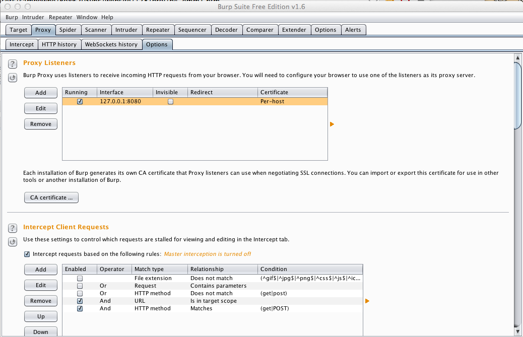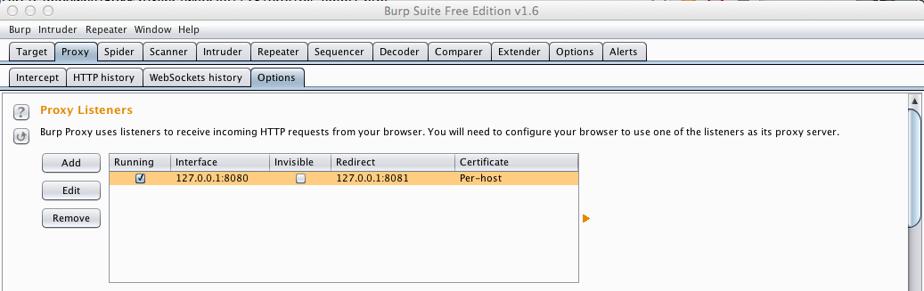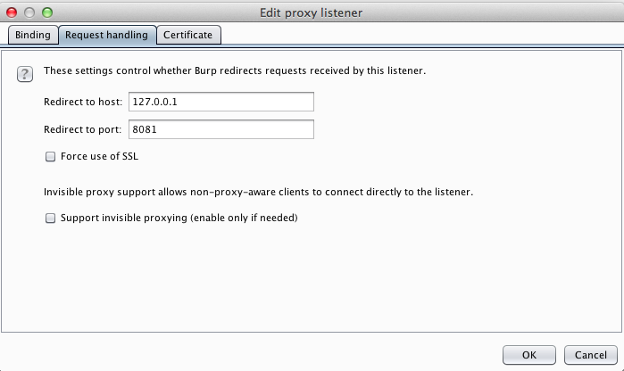 Click OK. Burp now shows an Interface of 127.0.0.1:8080 and a Redirect of 127.0.0.1:8081, as shown below.