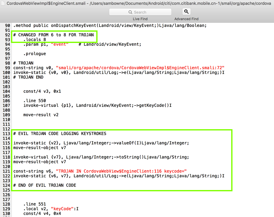 The "constructor" method now contains Trojan code, which makes a log entry each time it runs. Every method in the app has similar Trojan code in it now.